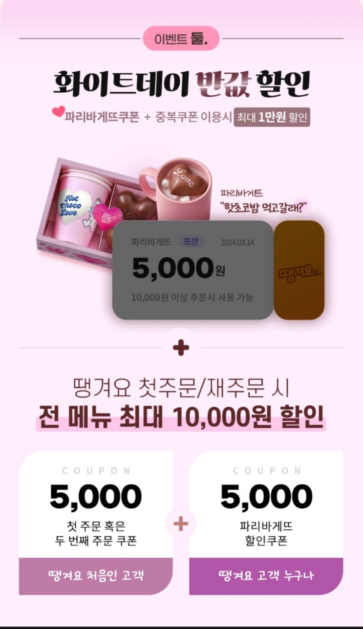 땡겨요 파리바게뜨 포장 5천원 할인쿠폰 받으세요!(1만이상 구매시사용)