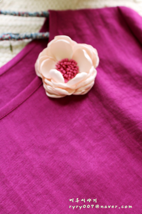 찰랑찰랑~ 인견원피스 꽃자주. 반품 약 54cm 총장 110cm 조금 분위기 바꿔서 어울리는 코사지와 찍어봤습니...