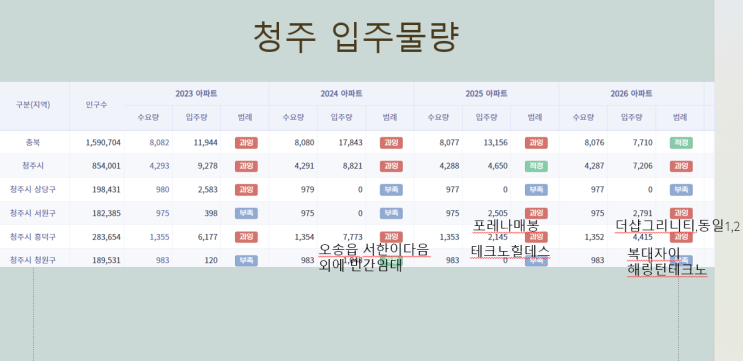 먼저 청주의 입주물량부터 살펴보겠습니다. 향후에도 계속 많은 편입니다. 특히 26년 입주는 많으니 분양권...