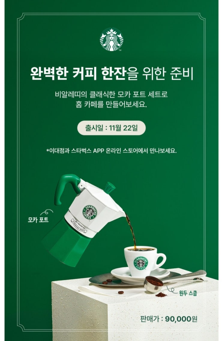 스타벅스 비알레띠의 클래식한 모카포트 세트로 홈 카페를 만들어보세요. 출시일 : 11월 22일 이대점과 스...