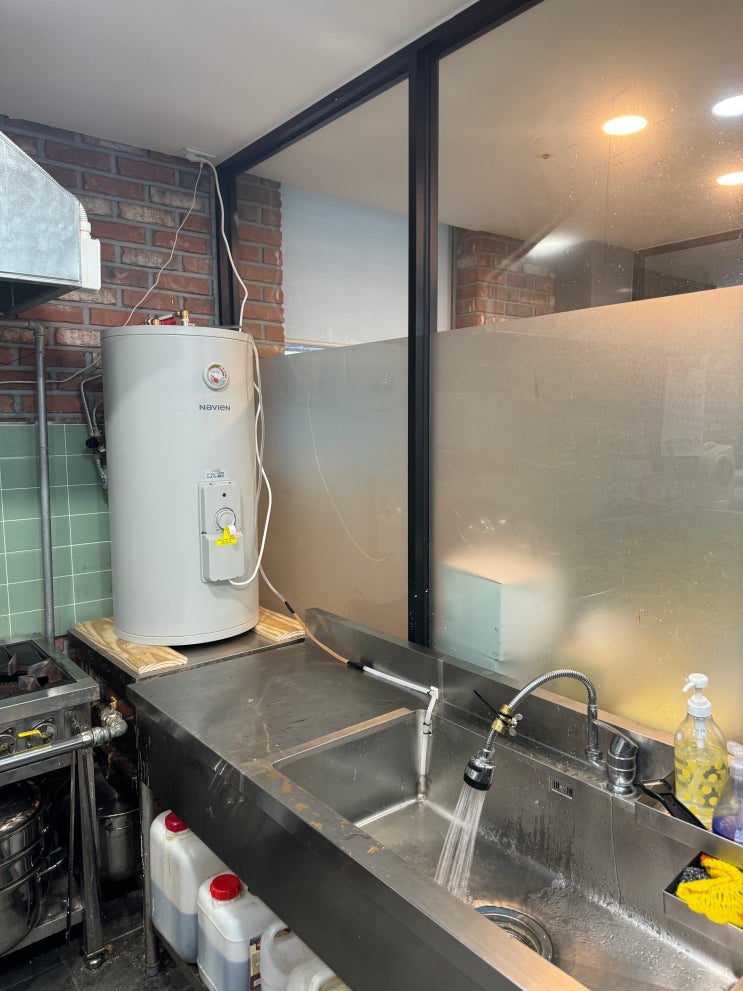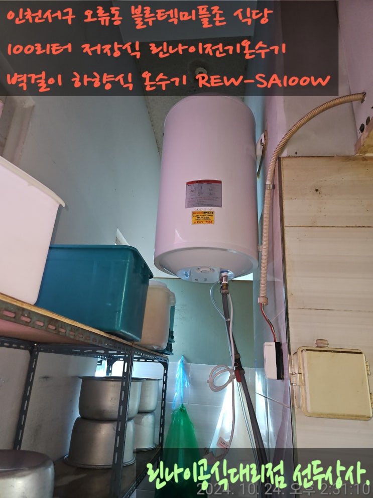 인천서구 오류동 블루텍미플존 식당 전기온수기 교체 / 100리터 벽걸이 전기온수기 / 린나이온수기