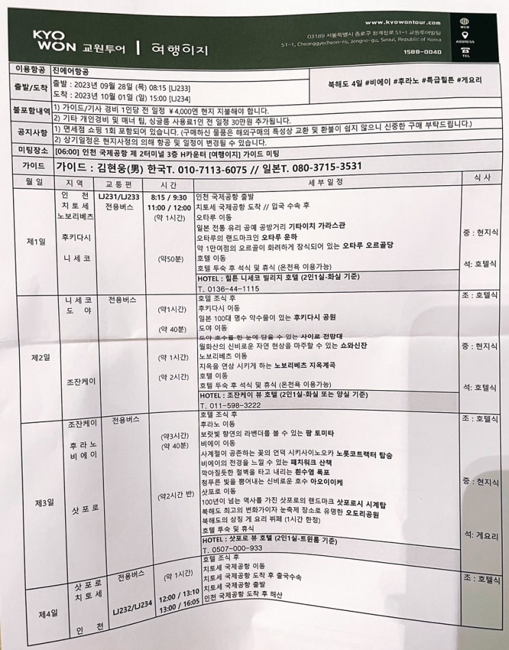 일본 훗카이도 북해도 추석 패키지 여행 3박 4일 내돈내산 솔직후기 (일정표, 여행이지, 마녀여행사)