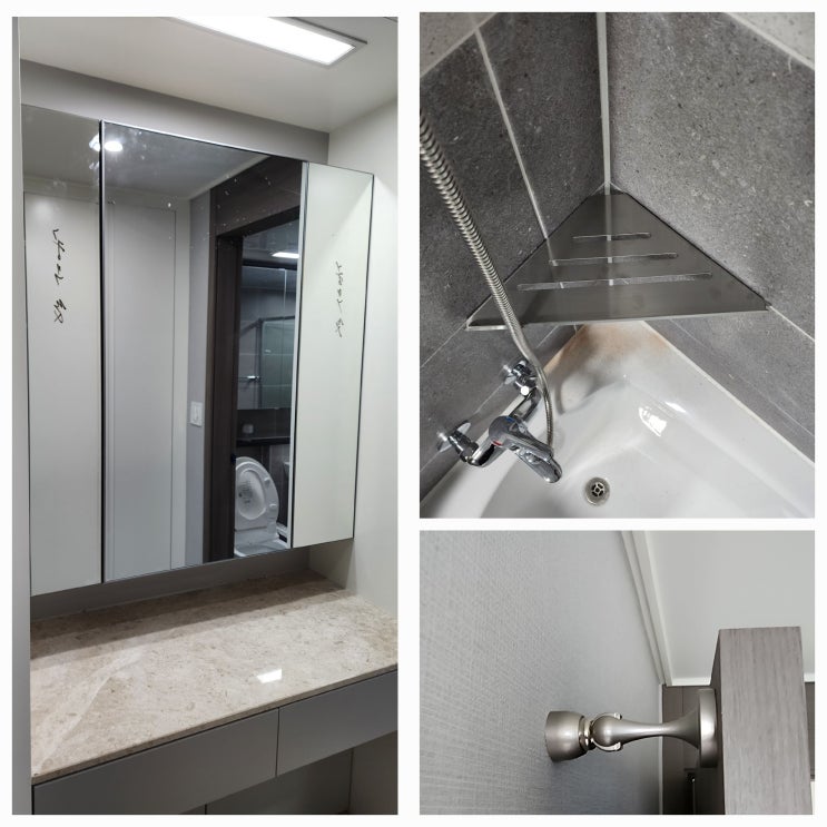 부산 연산포레서희스타힐스 아파트 안방화장대문 흑틀 은경문, 욕실 스텐코너선반, 방문스토퍼 설치 / 일광선반