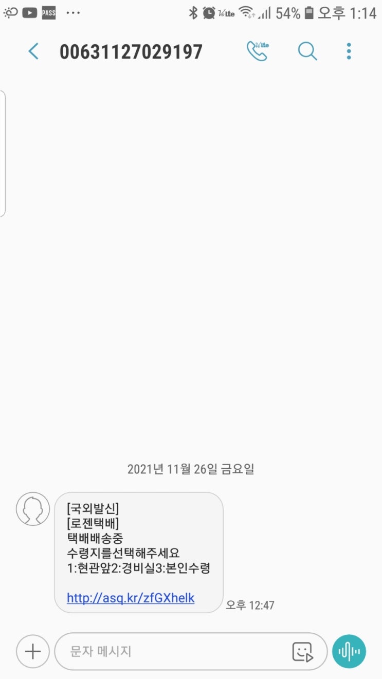 스팸문자 로젠택배 택배배송중 수령지 선택 보이스피싱 스미싱 사기문자주의