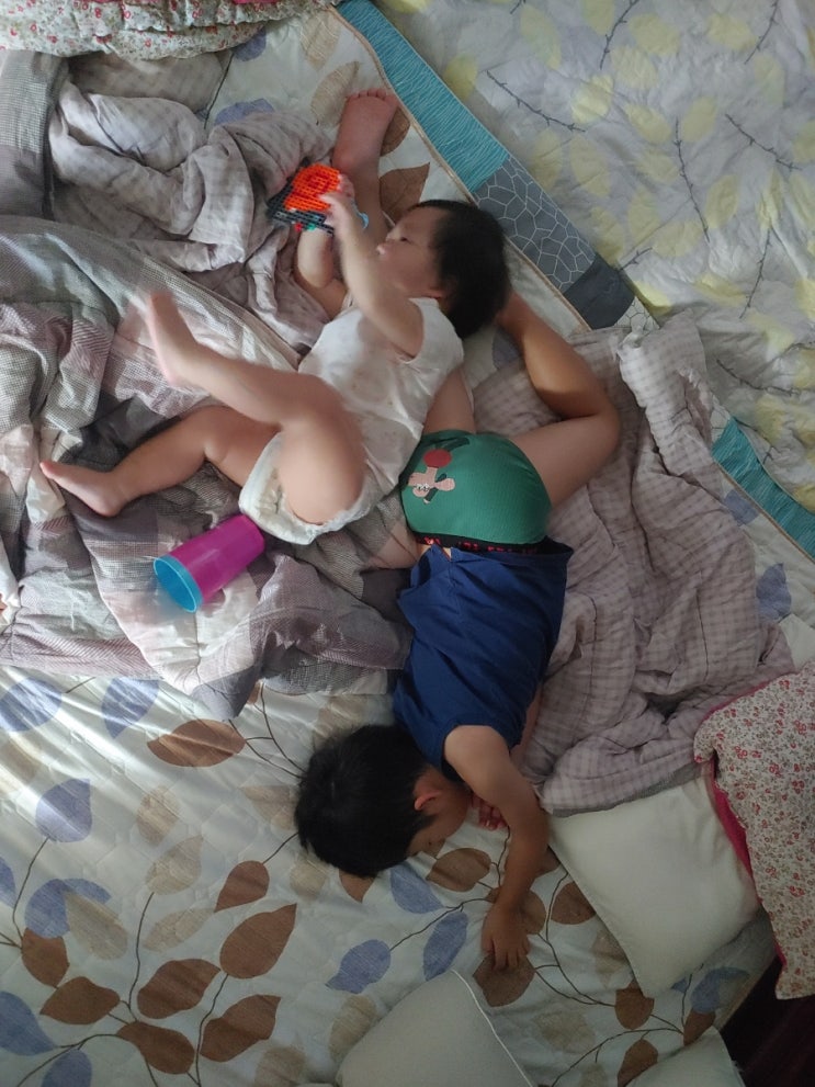 딸아이는 오빠를 너무 좋아합니다. 오늘도 일어나서 바로 오빠 다리에 다시 눕고 배시시 웃습니다. 아들은 ...