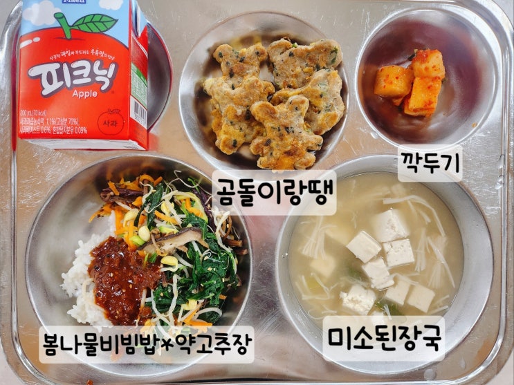 3월 29일 급식은 발아현미밥, 얼갈이된장국, 계란말이, 마파두부, 깍두기 였어요^^ 마파두부가 매콤달콤하...