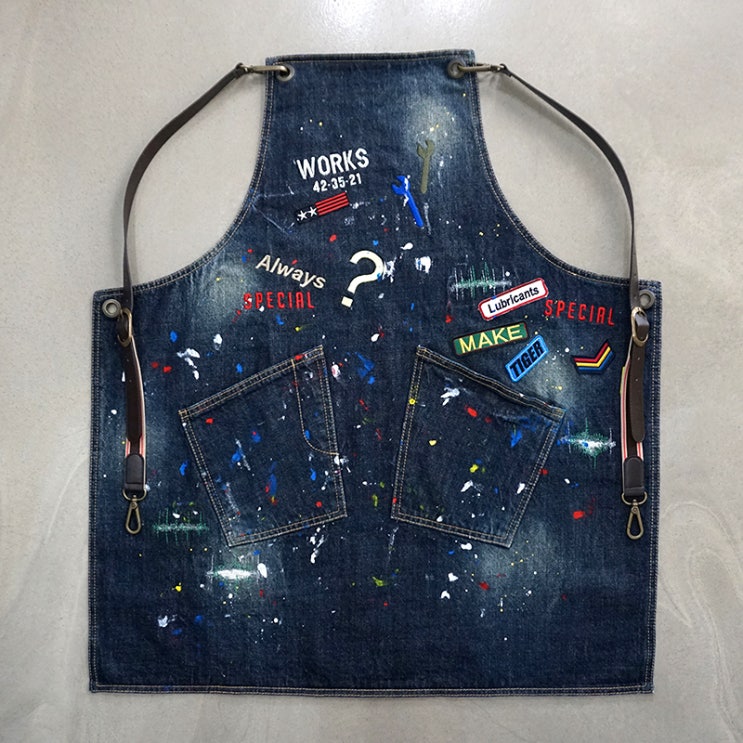 [미용앞치마] 자수가 돋보이는 인디고스티치 데님 앞치마 자수 작업이 정성스럽게 들어가 더욱 유니크해진 ...