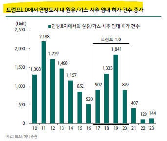 연방토지 내 원유/가스 시추 임대 허가 건수가 바이든 시절 확실히 줄었다. 트럼프1.0일 때는 허가건수가 ...