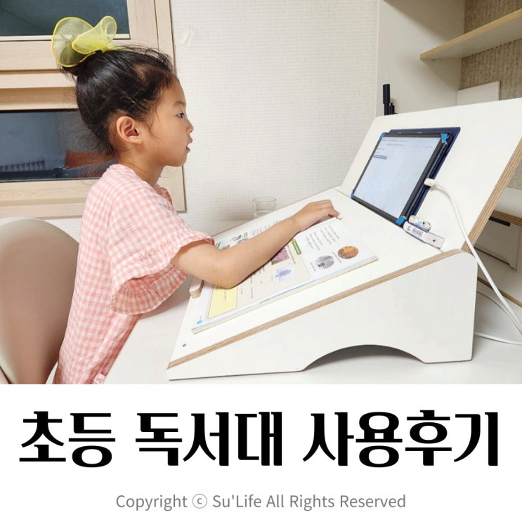 거북목 예방과 바른 자세를 위해 선택한 2단 원목 독서대 초1이 된 쑤는 패드 수업으로 동영상 강의도 듣고...