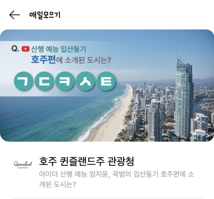 앱테크/카카오페이-호주 퀸즐랜드주 관광청 퀴즈타임 (초성 ㄱㄷㅋㅅㅌ)
