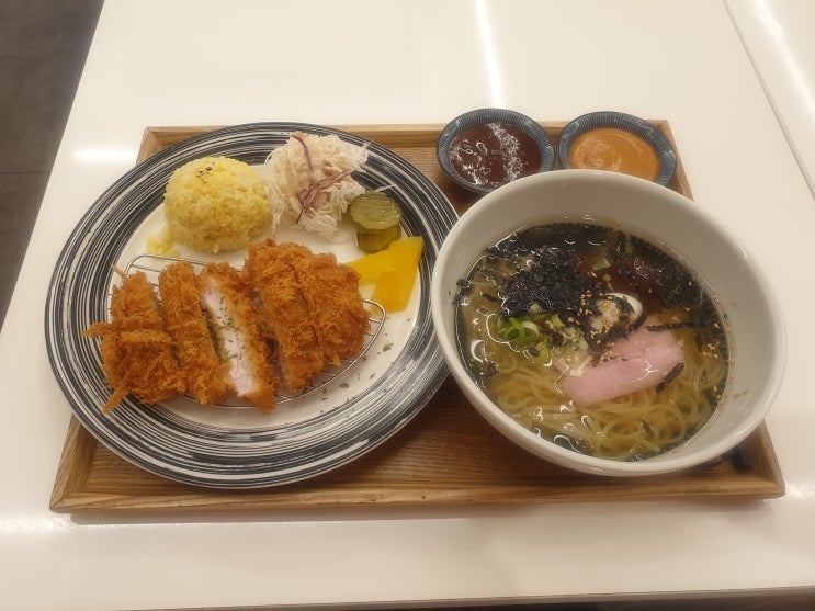 냉우동 세트(1.1만)를 시켜먹었다. 새우튀김 1개는 면류에 기본적으로 나오고 냉우동(8천)에 돈가스 절반(3...