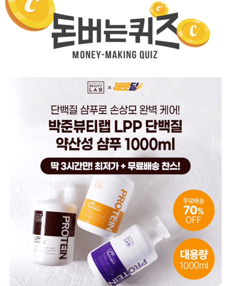 12월16일 캐시워크 돈버는퀴즈 정답 손상모 케어의 공식은 역시 박준뷰티랩! 단 3시간 동안 진행되는 "캐시딜" 타임특가에서 4분에 1개씩 판매되는 LPP 단백질 샴푸 1000ml