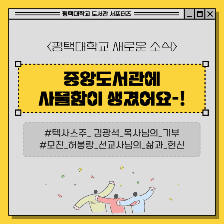 안녕하세요! 도서관 서포터즈 양민서입니다? 오늘은 평택대학교 도서관의 새로운 소식을 전하러 왔는데...
