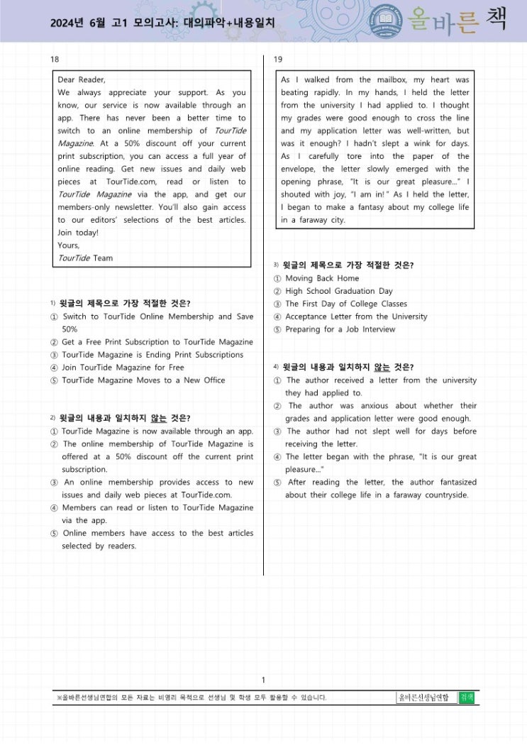 안녕하세요. 올바른선생님연합 영쌤이에요^^ 오늘은 6월 모의고사 분석노트 올바른책 PDF 파일 공개 다...