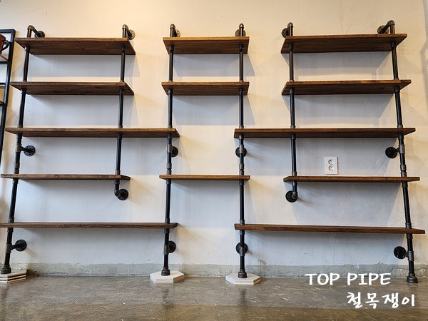 대전 신탄진 어느 골목에 카페 오픈을 앞두고 벽선반과 주방선반을 파이프 선반으로 시공하려는 이웃님의 ...