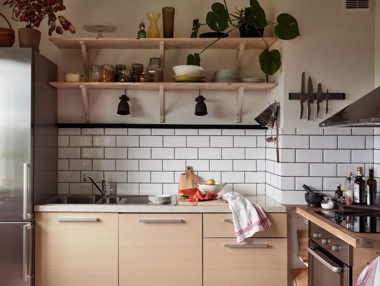 상부장없는주방에 주방벽선반 안정감을 주는 짙은 색상의 컬러조합 엿보기