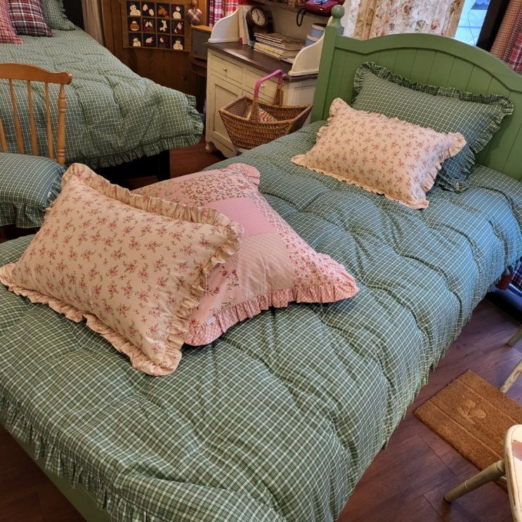 빈티지,레트로 감성 가득한 예쁜 체크에요? 감성패턴 세이지 그린체크로 제작한 싱글,슈퍼싱글 마이크로...