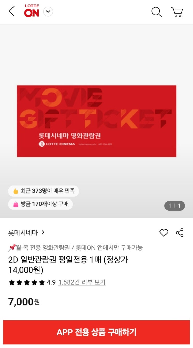 롯데시네마 영화 1인 7천원 쿠폰
