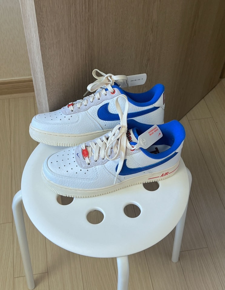 오늘 데려온 제품은 나이키 에어포스 유니버시티 블루 앤 서밋 화이트 ? 제품입니다:) 빈티지한 색 조합...