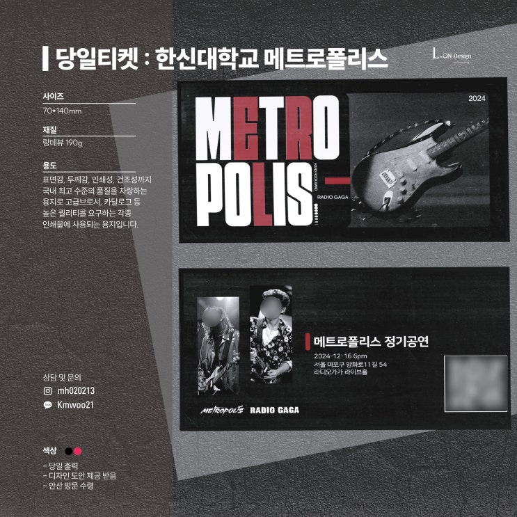 안녕하세요, 엘온디자인입니다. 한신대학교에서 메트로폴리스 공연 티켓 당일 제작 맡겨주셔서 신속하게 작...