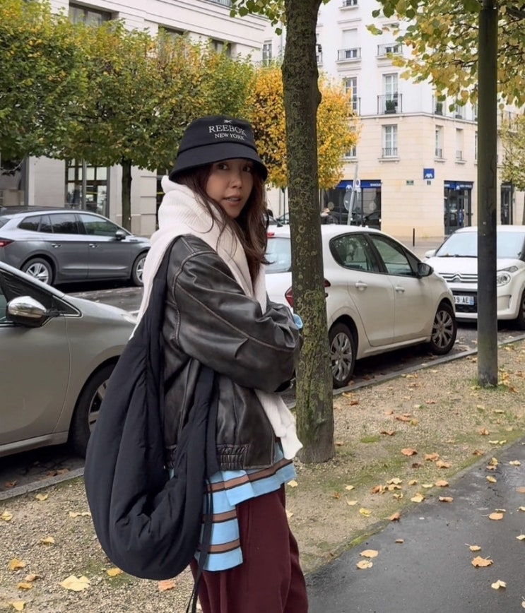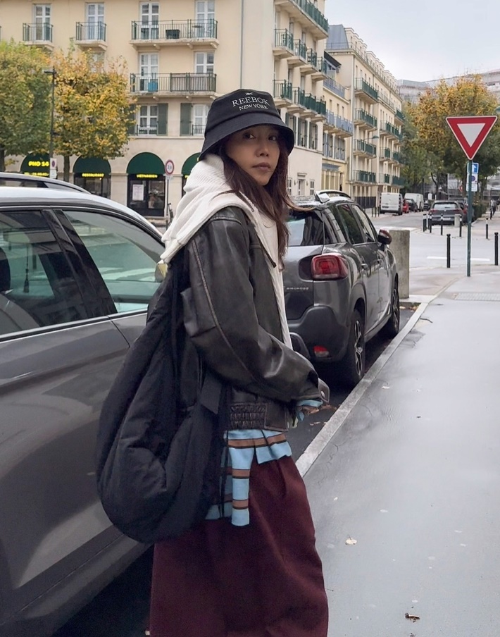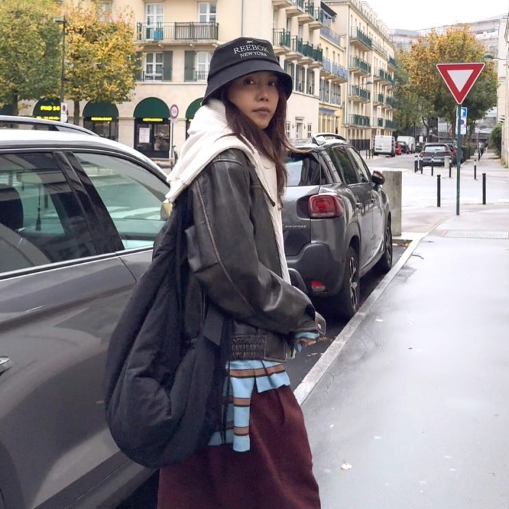 스타일 좋고 옷 잘 입는 채정안님 프랑스 파리 ootd 도 멋스럽죠 버건디 후드티 셋업에 레더 자켓을 매치해...