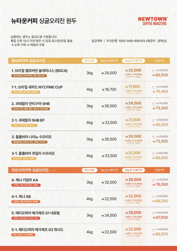 뉴타운커피 원두납품 단가 안내(24-12-24기준)