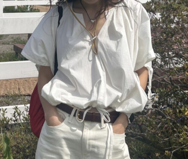 브이넥 셔링 루즈핏 반팔 빅사이즈 셔츠 블라우스 루즈하게 툭- 또는 소매끝과 밑단의 스트랩을 조여 벌룬 ...