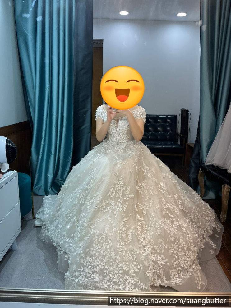 더 청담은 맨 처음에 가면 메이크업을 안 한 상태로 드레스를 고르고 드레스 피팅을 해요. 풍성 1개, 빈티...