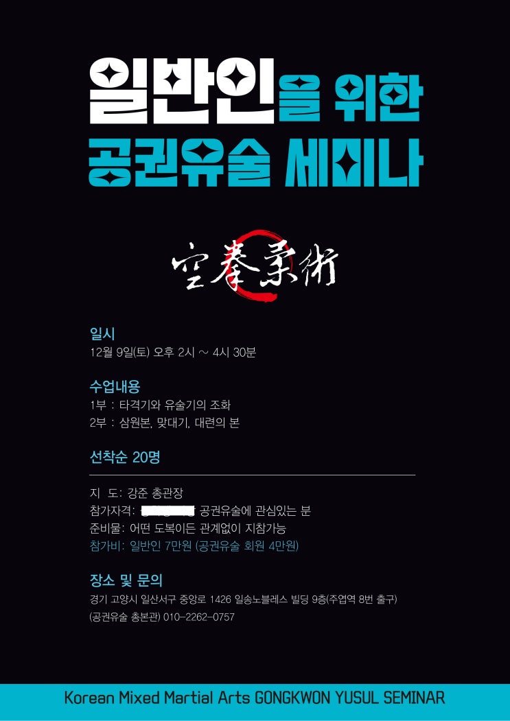 강준 관장님의 공권유술 세미나 세미나 주제: 타격기에서 유술기로의 연계 장소: 주엽역 3호선 8번출구 일...