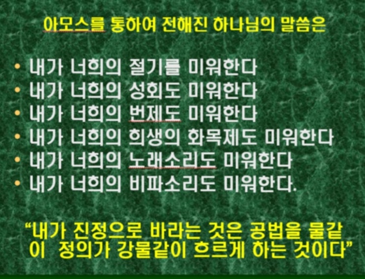아모스의 정의사역 정의를 물같이, 공의를 마르지 않는 강같이(아모스 5:21-24) 공의를 마르지 않는 강같이...