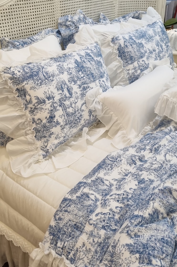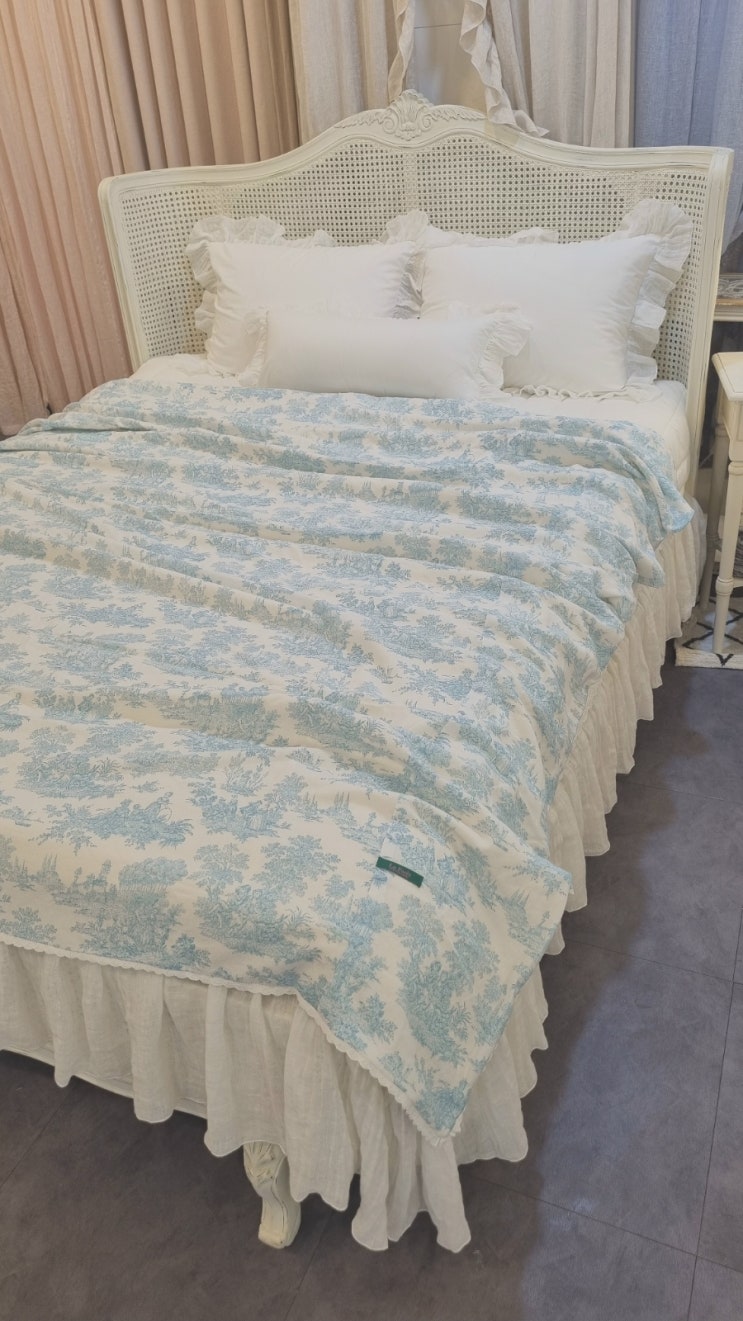 고급스러운 패턴과 시원한 컬러감이 특징인 블루 뜨왈드주이 원단으로 만든 사계절 이불입니다 뜨왈드주이 ...