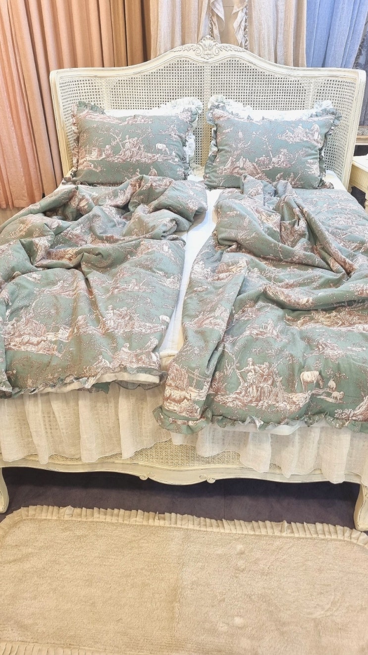 로맨틱한 프랑스 감성을 담은 그린컬러의 뜨왈드주이 패턴으로 침실분위기를 바꿔보세요~