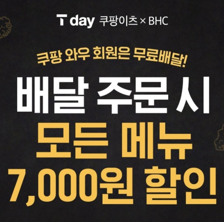 T멤버십 T데이×쿠팡이츠 BHC 7,000원 할인 (10.07~10.11) T데이 쿠팡이츠 BHC 7,000원 할인혜택 ...