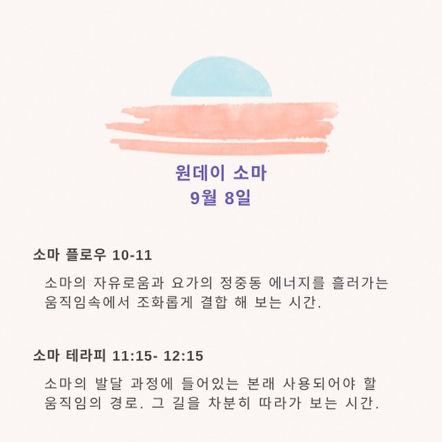 9월 8일 일요일 원데이 소마요가를 엽니다. 원데이 소마는 소마 플로우와 소마 테라피 두개의 클래스로 구...