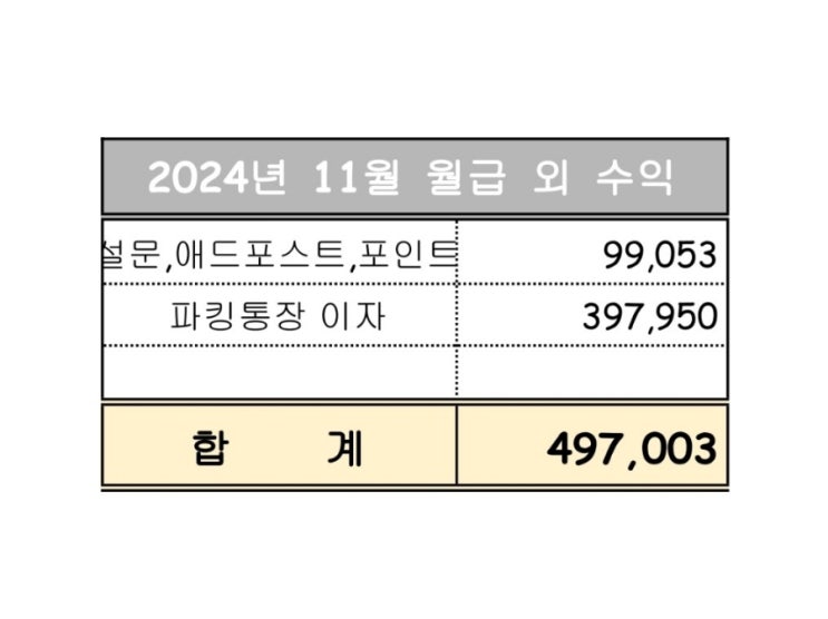 지난달과 수익은 거의 비슷해요. 파킹통장 이자가 좀 줄었고 설문조사와 애드포스트가 추가됐어요. 주식은 ...