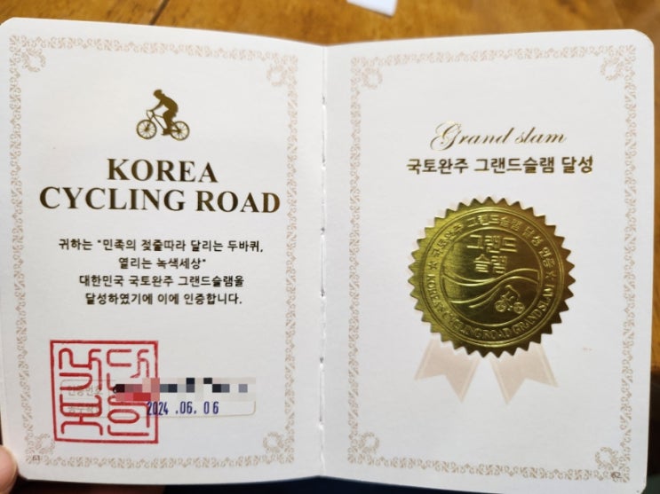국토종주자전거길 국토종주수첩 모든 스탬프를 찍고 그랜드슬램 인증스티커 받았습니다. 작년 8월에 시작해...