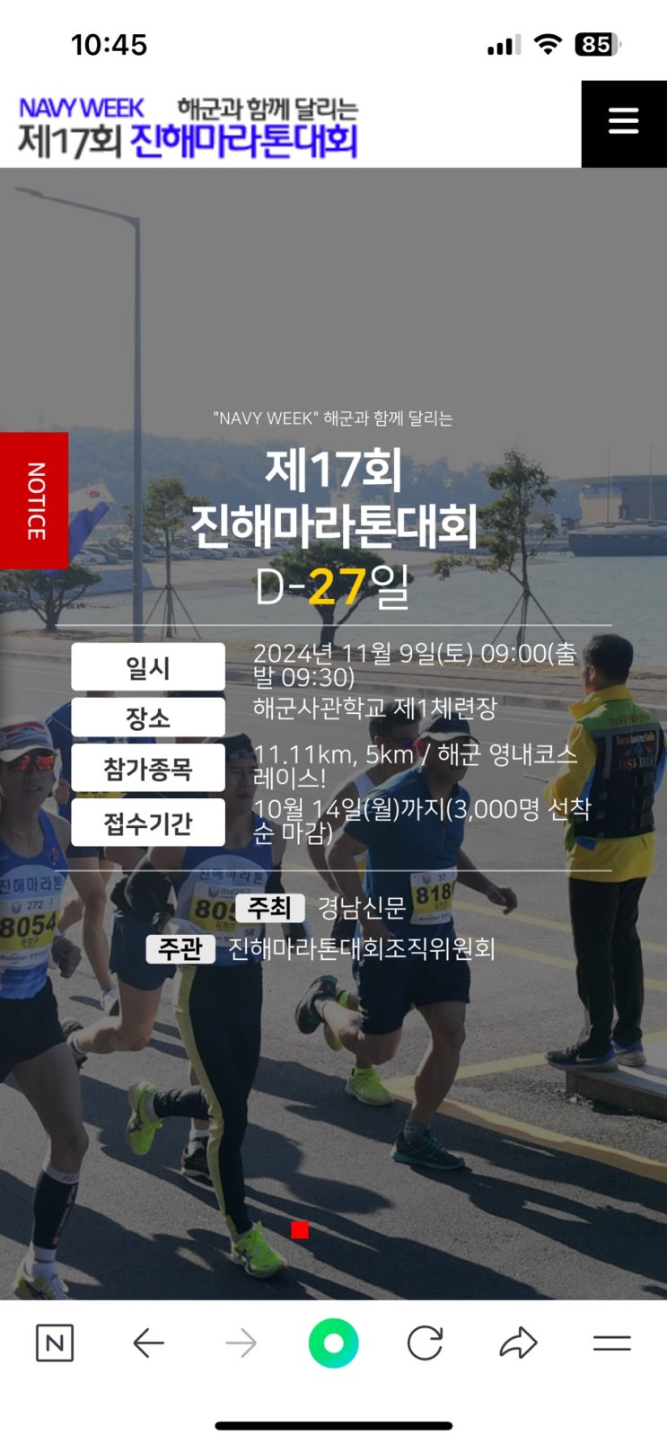 241109 토 오늘은 올해 두번째 마라톤! 11/11 해군 창설 기념일을 맞이하여 특별코스11.11km를 뛴다요 해군...