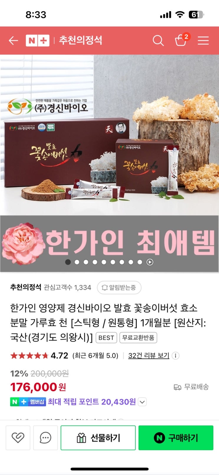 한가인 자유부인 유튜브 영양제 추천 편 꽃송이버섯효소/슬리밍보틀 구매