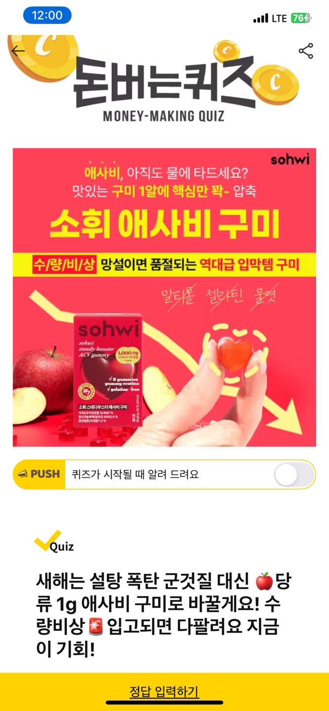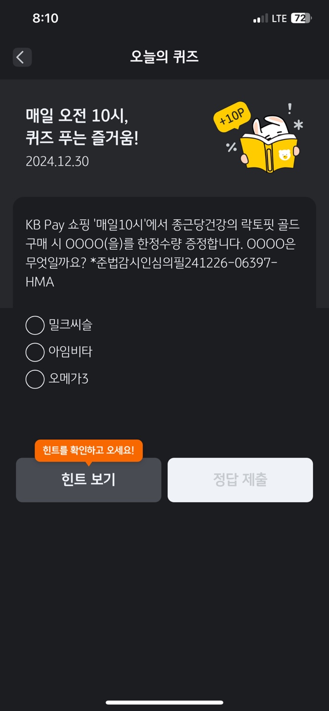 [캐시워크]12월 30일 돈버는퀴즈 소휘애사비 리필드 컷슬린포 한국생활건강연구소 타트체리
