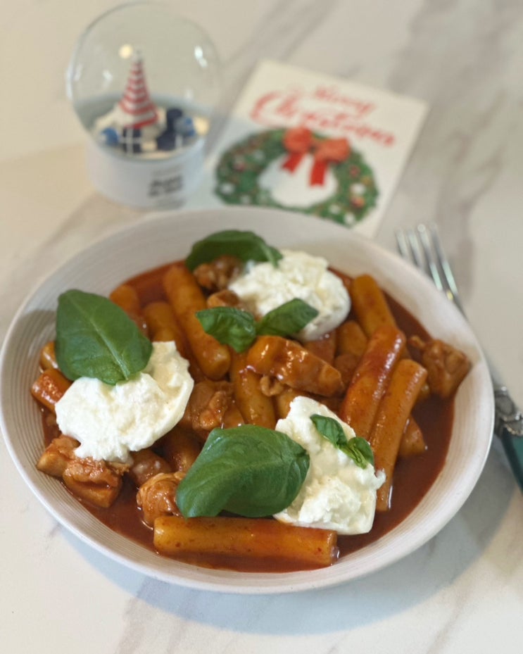 매콤한 떡볶이가 먹고싶어 오랜만에 간식으로 떡볶이를 만들어봤어요. 어묵대신 닭다리살과 부라타치즈를 ...