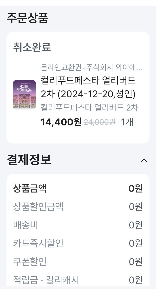 컬리푸드페스타 취소 환불 후기 11월 25일에 컬리푸드페스타, 얼리버드 2차 티켓(12월 20일)을 구입했는데 ...