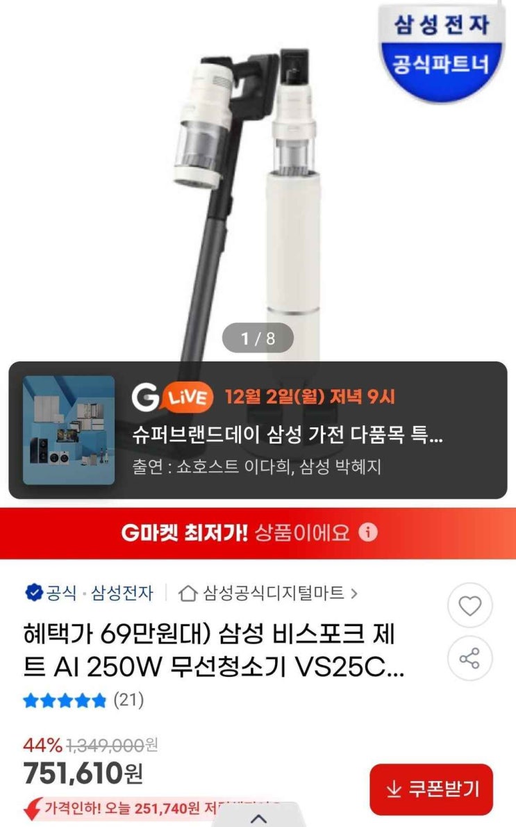 삼성 비스포크 제트 AI 무선청소기 250W, 699,000원에 득템할 기회! 과연 살만한 가치가 있을까요? 꼼꼼...