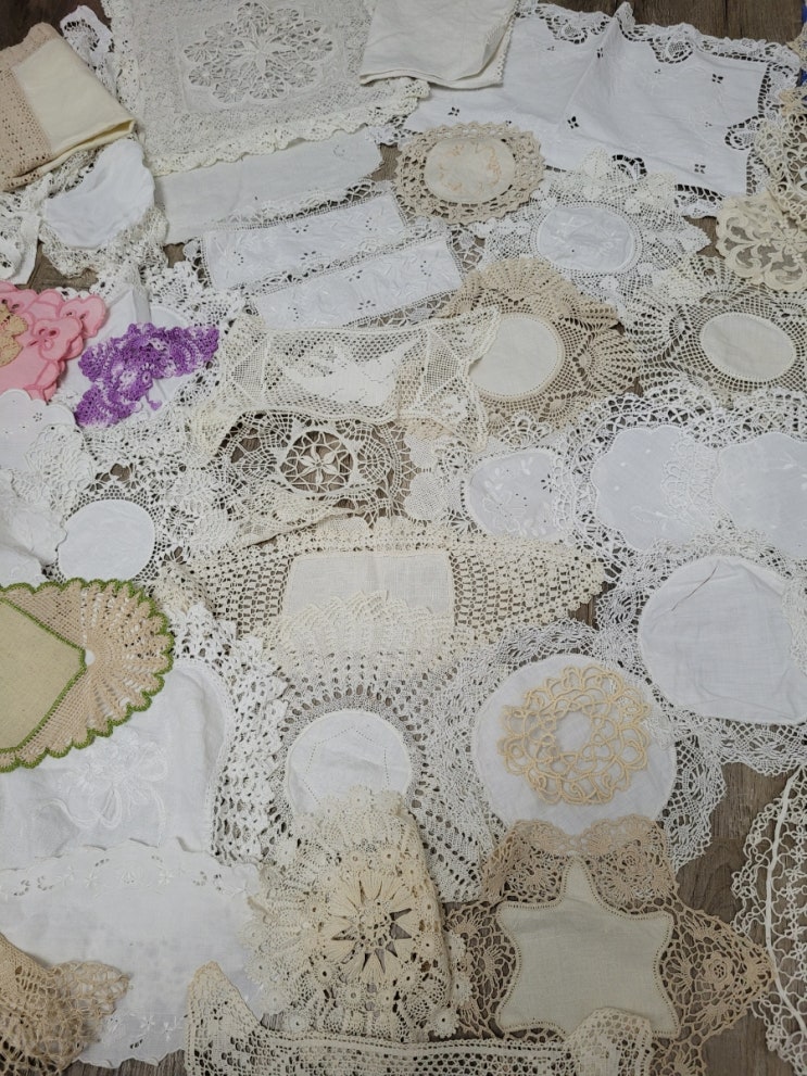 앤틱,올드 빈티지 리넨 크로쉐레이스도일리들 이에요~~ 리넨위에 흰색같은실로 자수놓아져 있기도하구요 손...
