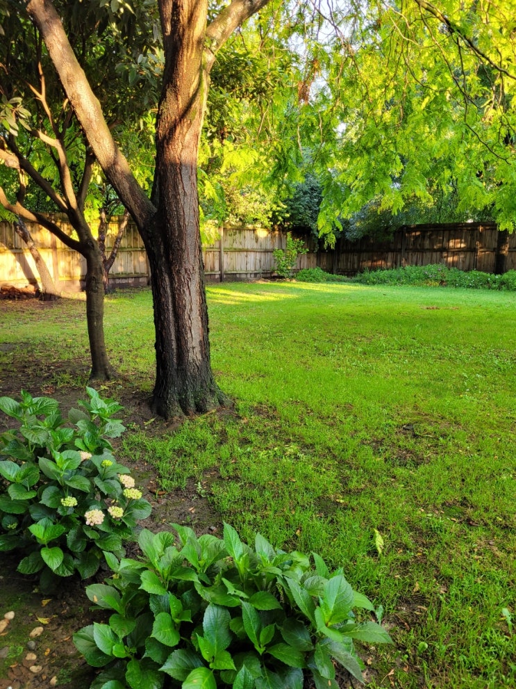 저희 집 백 가든이에요~ 비가 그치고 싱그러운 나무 줄기가 땅에 닿을듯 말듯 ~ 내일 소형자수보, 대형테이...