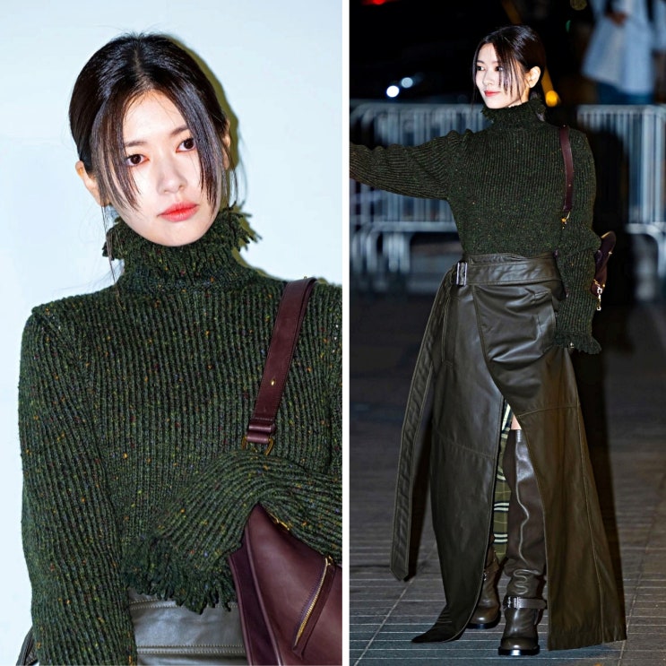 (카키색 코디) 정소민 옷 패션 니트 롱부츠 버버리 가방
