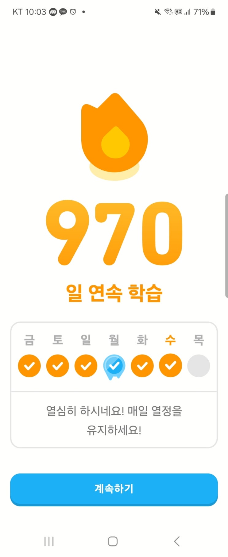듀오링고 영어 연속학습 971일째. 나는 오늘도 재밌게 살았다. 나는 오늘도 신나게 살았다. 나는 오늘도 잘...