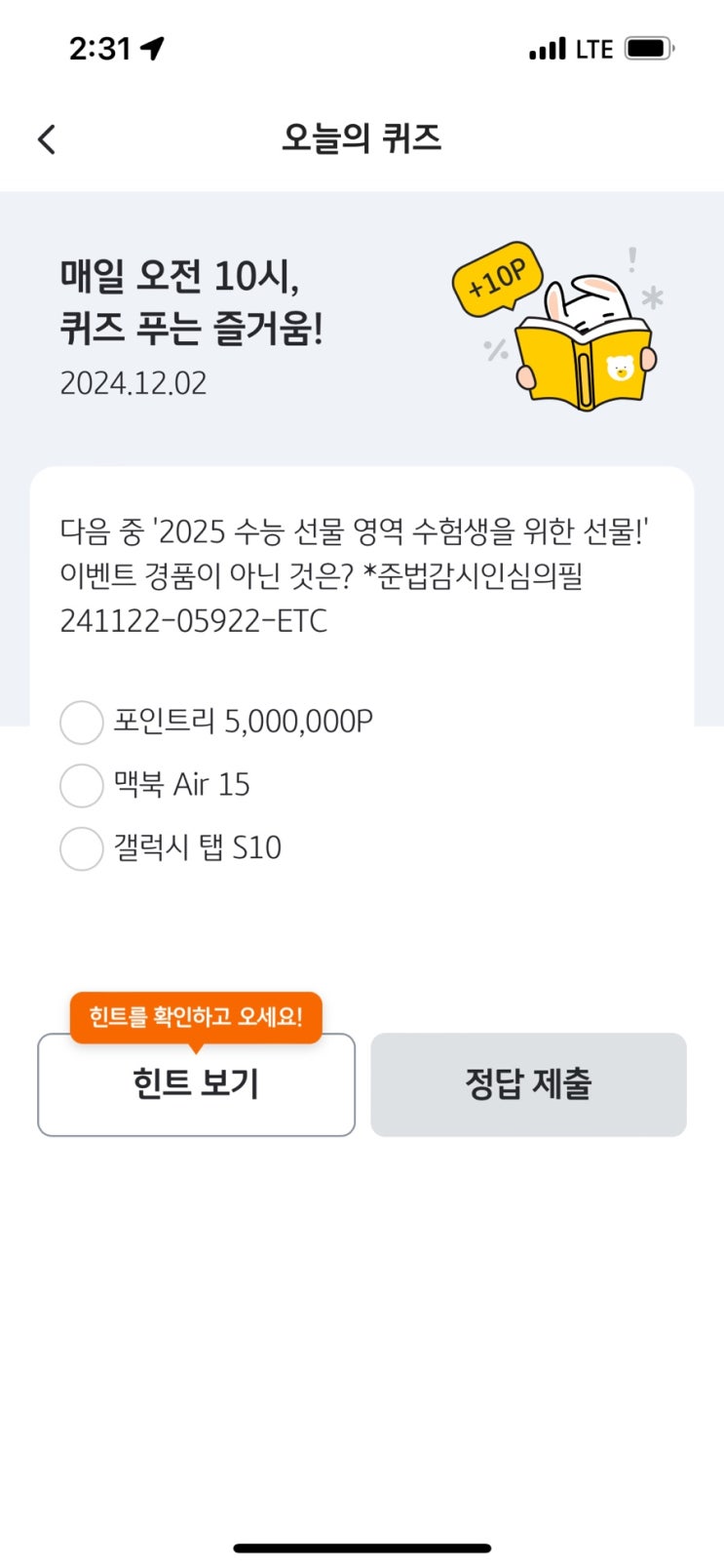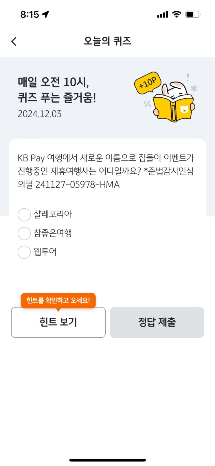 국민 리브메이트 오늘의퀴즈 12/10일자 정답