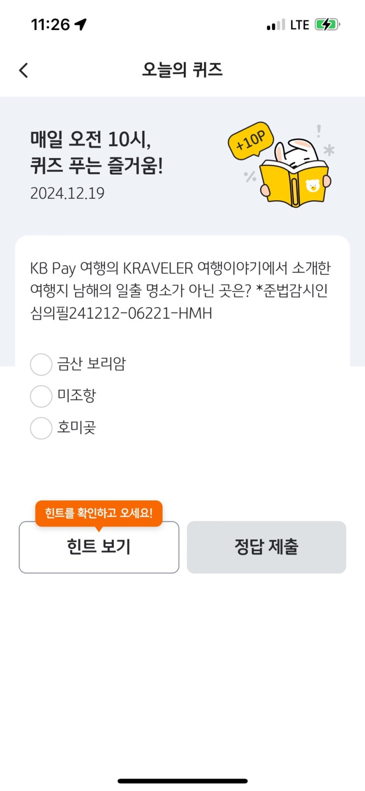 국민 리브메이트 오늘의퀴즈 12/19일자 정답
