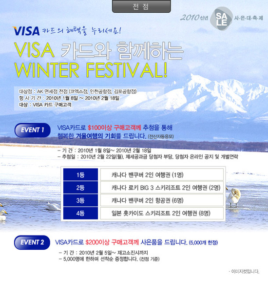 AK면세점 이벤트 VISA카드와 함께 하는 겨울 페스티벌 기간 : 10.01.08 ~ 10.02.18 대상 : 코...