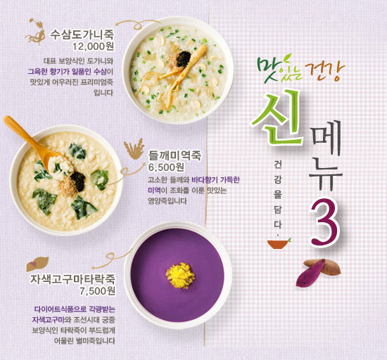 본죽 신메뉴 3종이 출시되었어요 !! 수삼도가니죽, 들깨미역죽, 자색고구마타락죽 3종인데요...